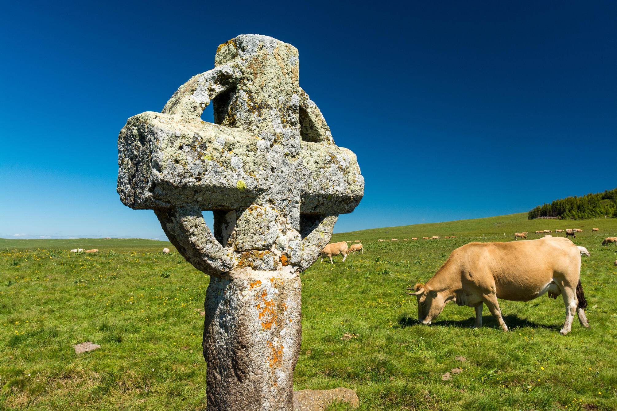 Pour cette première étape, vous traverserez une partie de l’Aubrac, plateau volcanique et granitique consacré à l’élevage.